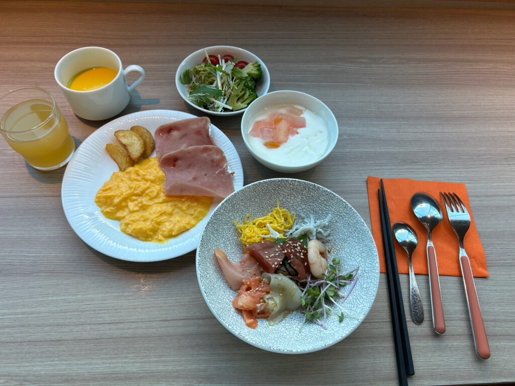 1階のフリースペースが朝はバイキング用の席となっており、あまり広くはないものの手がよく込んでいます。