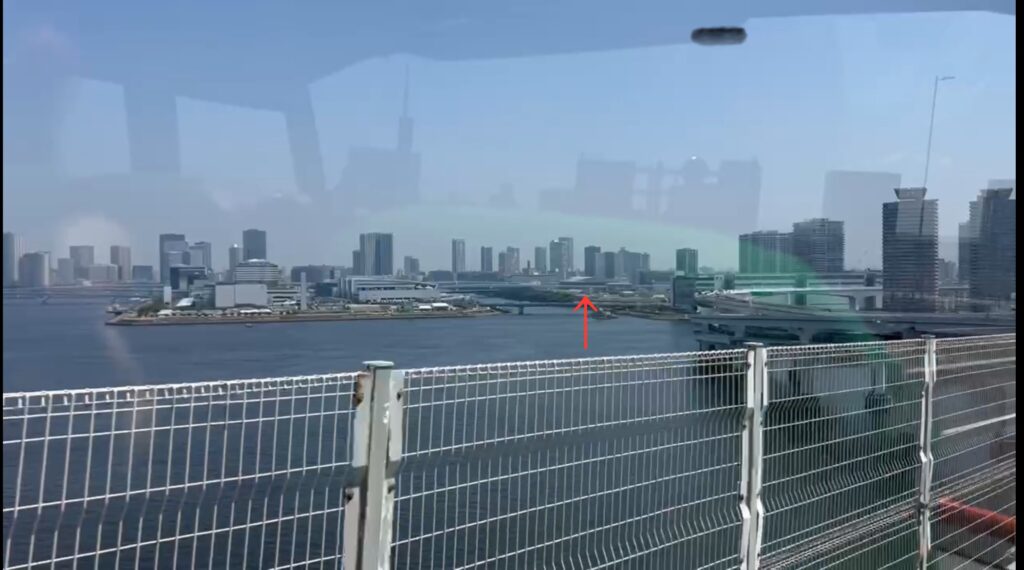 左手が豊洲市場、赤い矢印の場所が有明アリーナ