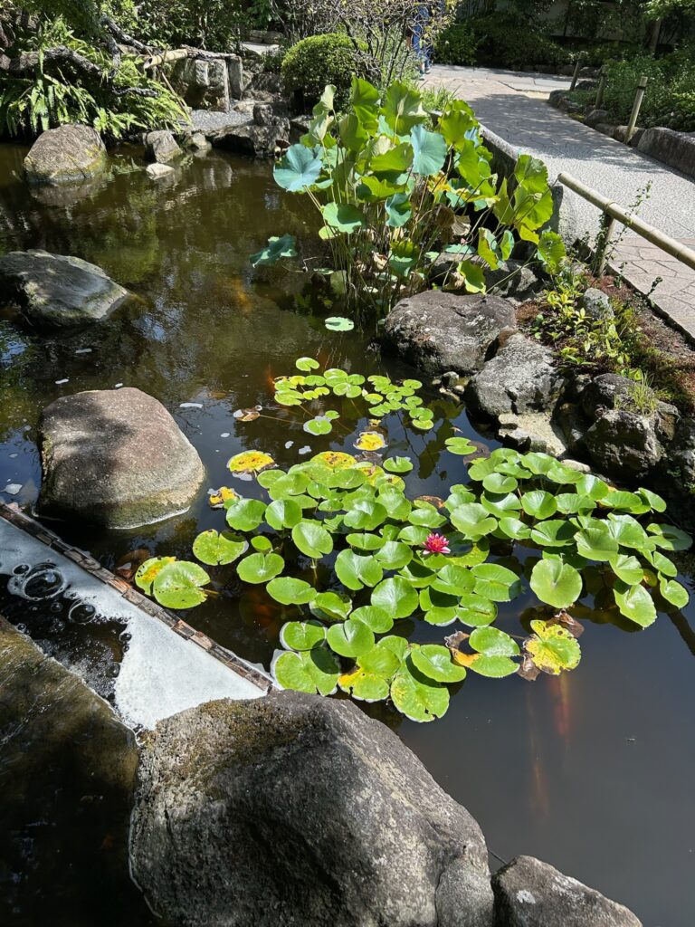 蓮の花が咲いており、鯉・アメンボがいました。風流だねぇ。